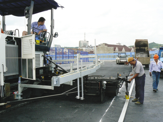 近日,记者来到大桥建设工地,各种工程车辆来回穿梭,施工人员正忙着铺设沥青混凝土。太阳下地面温度高达45度左右。施工员蒋志军说,从7月20日起,施工人员起早摸黑,从早上5点半到晚上7点,除中午休息时间外,每天连续工作在10个小时以上,每天要完成1000平方米中粒式沥青混凝土的铺设。