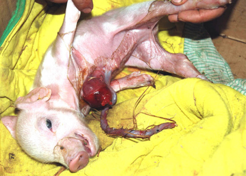 当晚,该村养猪大户吕才仁发现:一头正常生产的母猪,突然生出一头心脏暴露在体外的小猪,体重1公斤左右,暴露在体外的心脏直径4厘米左右,这是他养猪5年来首次发现心脏在体外的一头异形小猪。
