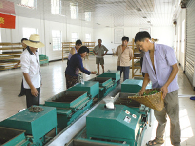 在崇仁镇应桂岩名茶加工集聚区内,每天有29台名茶机械忙个不停,茶叶日均产量200公斤。按照目前市场价每公斤50元计算,日均收入达1万多元。由于今年气候条件较为有利,夏秋茶生产呈现出良好发展势头。图为应桂岩名茶加工集聚区茶农正在用名茶机械加工茶叶。