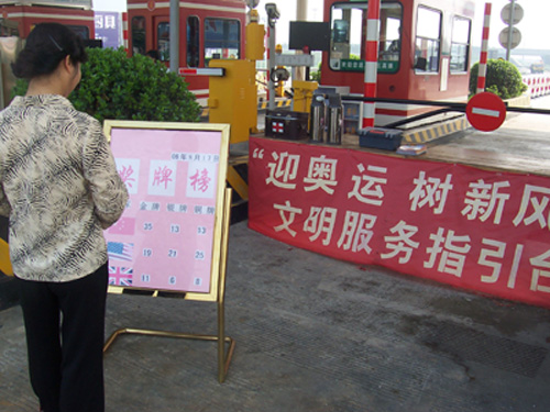 在不影响安全驾驶的前提下,上三高速嵊州收费站为方便外地,特别是跑长途的司机及司乘人员能及时了解中国奥运健儿在北京奥运会上的表现,特于8月8日奥运开幕后,在收费广场开设了一块奥运奖牌榜信息台。这也是上三高速嵊州收费站“支持奥运、服务奥运”主题月中的一项服务内容。(图为8月17日奥运奖牌榜信息)