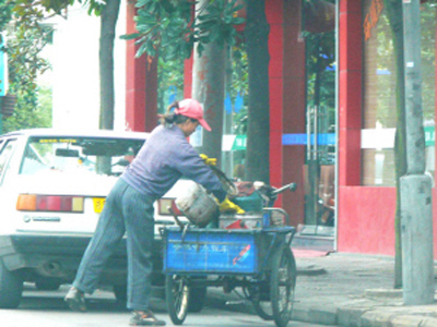 从越秀路口过来,下一站便是天乐大酒店,然后再从官河路的洁吉饭店一直向前。她一站一站地打捞,有时从窨井里打捞,有时则直接从泔水桶里打捞。一路过来,“围剿”到三江城时,车上的3只塑料桶已经装满了“战果”——“地沟油”。