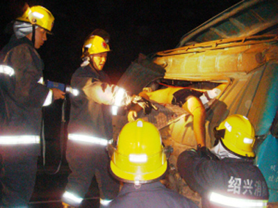 “坚强些,快了,快了,挺住!我们一定会救你出来!”8月22日零时10分许,甬金高速往金华方向94Km处(嵊州甘霖段),发生一起两车追尾交通事故,两人被卡,市消防大队接警后迅速派出2辆消防车14名官兵赶赴现场施救,一场与死神搏斗、与时间赛跑的救援行动悄悄展开……