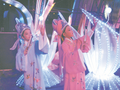 海上生明月,天涯共此时。9月14日晚上,《荣成月·中华情》2008央视中秋晚会在山东荣成的海上舞台精彩上演。来自我市城南小学一(4)班的王思颖(左)、罗星幼儿园的李奕(右)合演的“十八相送”赢得现场观众的阵阵掌声。