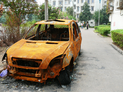 轿车自燃成废铁 占道堆放到何时