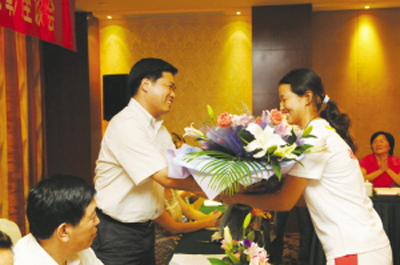 嵊州女儿宋夏群,家乡人民为你骄傲。昨日下午,我市举行欢迎嵊州奥运健儿宋夏群凯旋暨表彰座谈会,表彰在北京奥运会上取得优异成绩的嵊州籍运动员宋夏群,以及有关教练员和集体。市委副书记、市长盛秋平到会讲话并为宋夏群颁发荣誉证书,市委常委、宣传部长何国英,市人大常委会副主任陈自军,副市长夏春燕,市政协副主席杜洪苗出席座谈会。