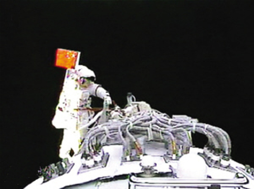 出舱后的翟志刚挥动鲜艳的五星红旗。随后,他取下飞船轨道舱外事先安装好的固体润滑材料试验样品,交给留在轨道舱里的刘伯明。接着,翟志刚在浩瀚的太空里缓缓行走。