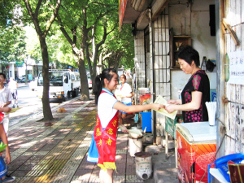为切实做好国家三类城市语言文字工作评估验收迎检工作,城南小学举行以“构建和谐语言生活、营造共有精神家园”为活动主题的校第十届推普周活动,活动主要内容有:“中华赞·诗词歌赋创作”主题活动、语言文字优秀论文评比、“小手拉大手啄木鸟”行动、“万家纠错字”活动等。图为该校的推普志愿者上街分发资料。