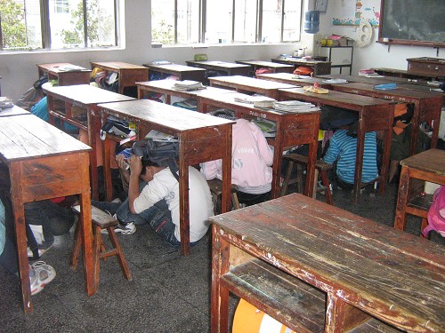 校园内响起紧急铃声,六(2)班学生们纷纷双手抱头,钻进桌子底下