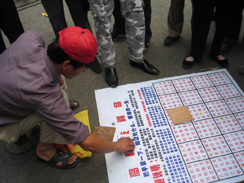 10月18日,笔者在市区文化广场城墙边看到,有个40岁左右的男子,利用所谓的高科技测字算命在施行骗术,自称能“把手量一下,知道姓什么,便知你一生。”他面前铺放着一张写着数百个姓氏的大纸,手里还拿着一叠巴掌大的卡片,每张卡片也都写着数十个姓氏。据这名男子介绍,只要你选出有自己姓氏的那张卡片,用它盖住大纸上有该姓氏的那部分,再让他量量你的五指长度和掌宽,他便可立即准确指出你姓什么;被猜中姓氏的人则需花2元换回一张写明自己一生运程的纸。见他测得很准,一些进城的百姓和外来民工闻言纷纷掏钱。