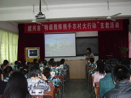 日上午,绍兴市“特级教师携手农村大行动”支教活动在黄泽镇校电化教室举行。