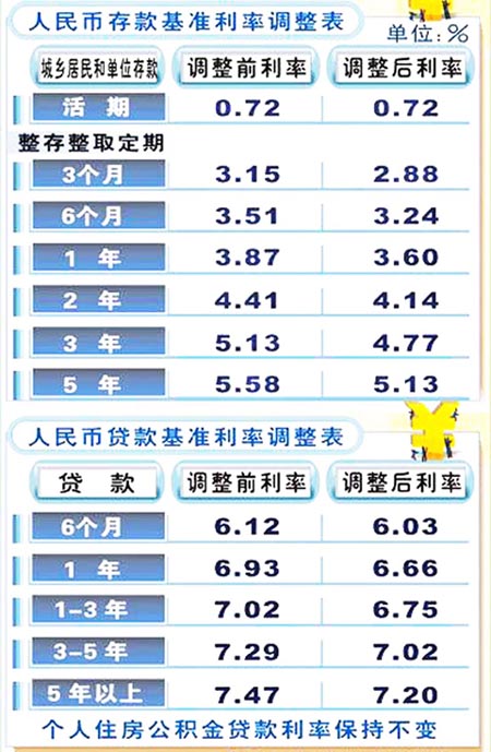 “这次降息的消息来得比较突然,我刚看了利率调整表,发现半年、1年、2年的利率都下调了0.27个百分点,3年和5年分别下调了0.36个百分点和0.45个百分点。”农行金融理财师、城北支行行长叶肖芳告诉记者,以10万元存一年定期存款为例,按调整前3.87%的年利率,到期利息收入为3870元,而按调整后3.60%的年利率,到期利息收入为3600元,两者相差270元。