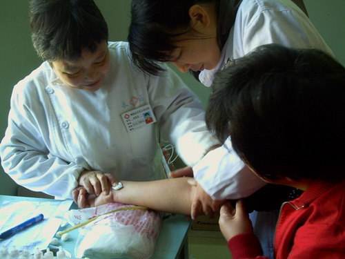 两年一次的参合农民免费的健康体检正在行动。长乐镇沃基村除了在校学生,将近有一千人参加这次体检,此次体检分三天进行,村卫生站每天都挤满了来体检的村民,下图为村卫生站医生正在给体检村民做抽血准备。