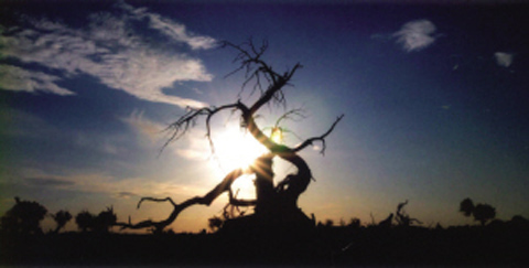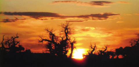 放眼望去,千姿百态的胡杨,在静默中挽一抹斜阳,被岁月消弭了生命颜色的身躯紫黑发亮。有的似骆驼负重;有的如龙蛇蜷地;有的似狮虎雄踞;有的如骏马嘶鸣;有的虽树冠被摧,肢断骨折,却依然挺起足以使世人瞠目的脊梁。大气中闪跃着“生当作人杰,死亦为鬼雄”的威光。站在它面前,你的心灵会接受庄严与神圣的锻打,你会忽然悟彻生命的壮丽与永恒其实是无声的——无声无息地成长,无声无息地壮大,无声无息地辉煌……