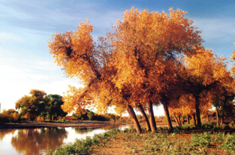 越往前行,越显幽静。蓦地,一泓波平如镜的海子裸呈在我眼前。阳光轻洒,映现高天流云的碧水便忽闪出锦缎般的光来。掬一口,每一根神经都透着清洌怡爽。在这仿佛混沌初开的漠野中,除了胡杨,还有什么能护住这晶莹透亮的海子呢?