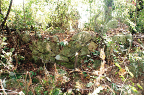 在当地一位老者的陪同下,我们沿着三溪村的梅溪自然村村口一条乱石铺砌的古道一路攀登,半小时后抵达这座被称为将台山的山冈南侧,发现一处人工筑成的台基残迹。台基由山体自然岩石及块石砌边,长约9米,宽约4.50米,根据地形判断,该台为坐南朝北而筑,北侧山冈相对平坦,传为起义军跑马场。