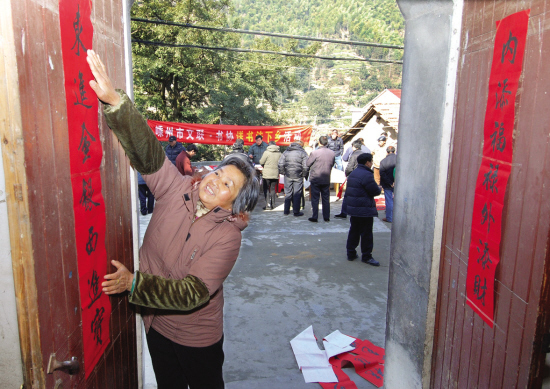 为丰富群众的精神文化生活,昨日上午,市文联组织书法家协会的书法名家,来到海拔700米的通源乡白雁坑村,开展“送书法下乡”活动。书法家们挥毫泼墨,书写了上百副喜庆与祝福的春联送到了村民手中,真是“张张对联送真情,条条春联暖人心”。图为村民洪亚利把刚拿到的春联贴到自家门上。