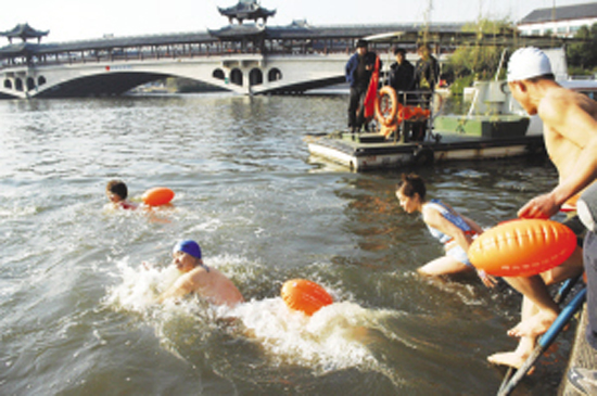 1月1日是全国第14个冬泳日,我市9位冬泳队员代表嵊州市参加了绍兴市首届冬泳表演赛。图为比赛场景。