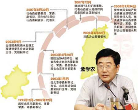 9月8日,山西省襄汾县新塔矿业有限公司尾矿库发生特别重大溃坝事故,事故发生的一个重要原因是当地政府及有关部门监督管理不得力。9月14日,孟学农引咎辞去山西省省长职务。这是孟学农第二次引咎辞职。