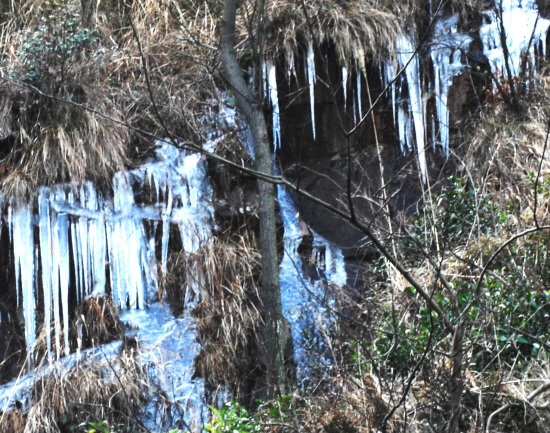 近日,同影友上仙岩镇舜皇村王舍岗拍摄风光片,在一座高山的半山腰处发现一片如帘的冰柱,最长的冰柱约有1.5米。