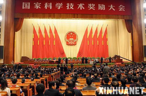 人民大会堂大礼堂里灯火璀璨,鲜花竞艳,气氛庄重而热烈。上午10时,大会在雄壮的国歌声中开始。中共中央总书记、国家主席、中央军委主席胡锦涛首先向获得2008年度国家最高科学技术奖的中国工程院院士、北京市神经外科研究所所长、北京天坛医院名誉院长王忠诚,中国科学院院士、北京大学教授徐光宪颁发奖励证书,并同他们热情握手,表示祝贺。在热烈的掌声中,胡锦涛等党和国家领导人向获得国家科学技术进步奖特等奖、国家自然科学奖、国家技术发明奖以及其他国家科学技术进步奖的代表颁奖。