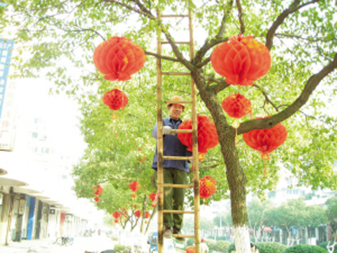 1月9日上午,在官河路,市园林管理处工作人员将一盏盏红色纸灯笼挂上枝头(如图)。据悉,市园林管理处将在官河路、北直街、江滨东路、富豪路以及剡园、文化广场等地挂放近6000盏纸灯笼,为剡城街头营造节日喜庆氛围。