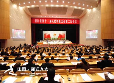 红旗飘扬,国徽闪耀。今天的省人民大会堂一派吉祥喜庆的气氛。今天上午9时,备受瞩目的浙江省第十一届人民代表大会第二次会议在雄壮的国歌声中隆重开幕。出席大会的635名省人大代表听取了省长吕祖善代表省政府所作的政府工作报告。