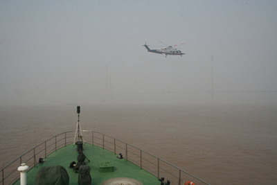 直升机与海巡113艇在舟山连岛工程最长的大桥——金塘大桥水域巡视。