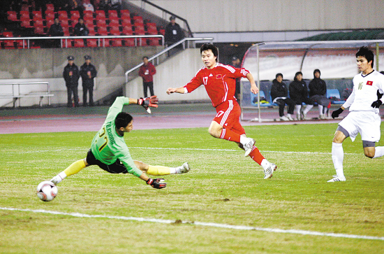 比赛进行到第11分钟,中国队矫哲在防守中失误,对方球队17号队员阮武风单刀直入破门,扳回一球,但平局局面并未保持多久。上半场比赛,除了郜林的两粒进球外,比赛第27分钟,中国队杜震宇脚球传出高质量弧线,后点杜威迎球垫射破门;比赛第36分钟,姜宁断球后晃过对方防守球员,直接一脚怒射破门。上半场结束时,中国队将比分定格在4比1。