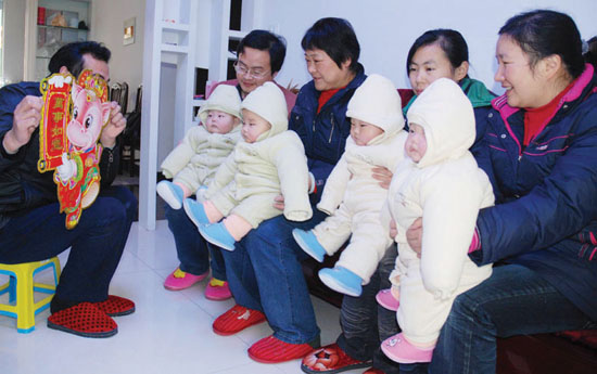 农历正月初一上午10时,笔者在四胞胎父亲俞朝家里,看到十分和谐温馨的一幕:亲戚们正拿着牛年的年画,给4个小宝贝上起了牛年第一课。