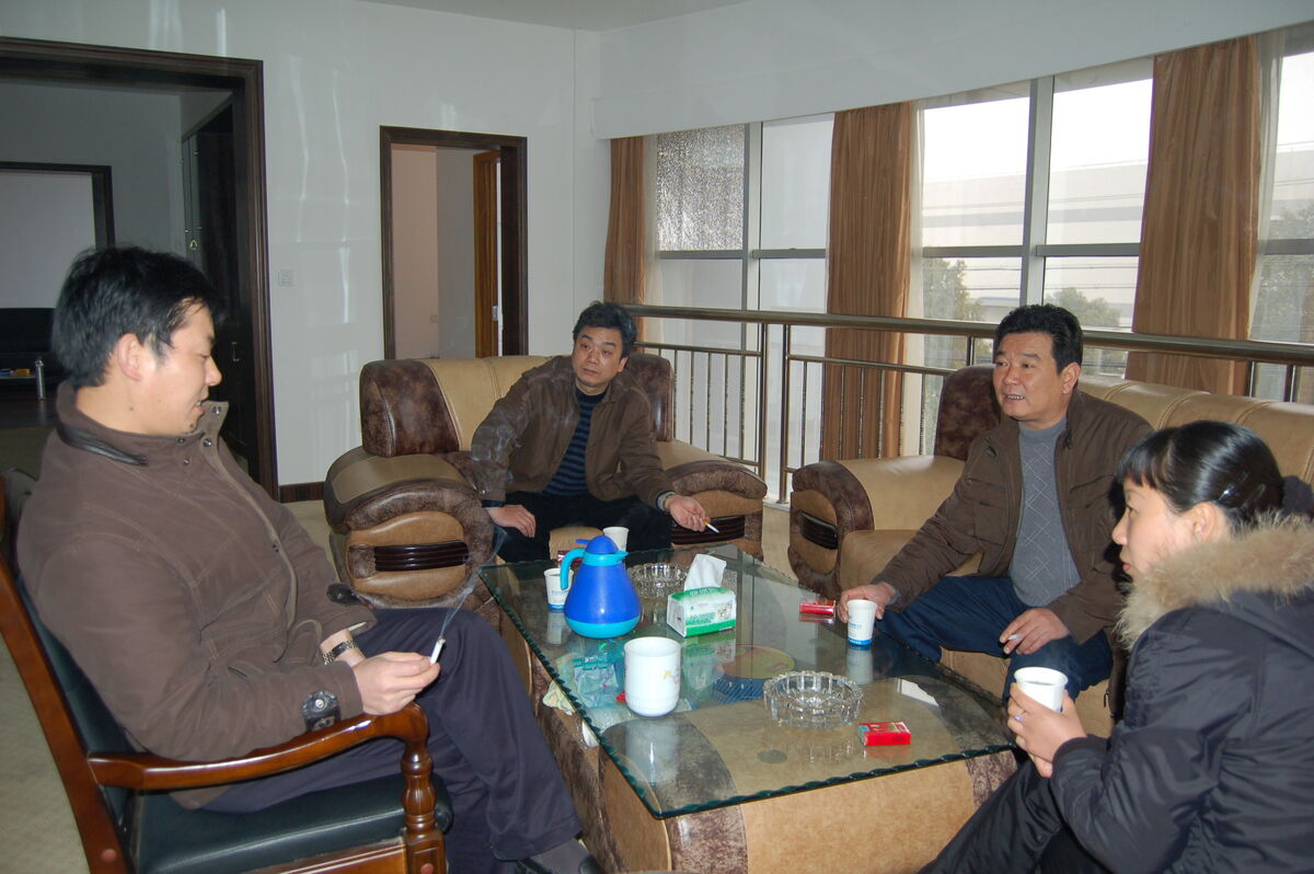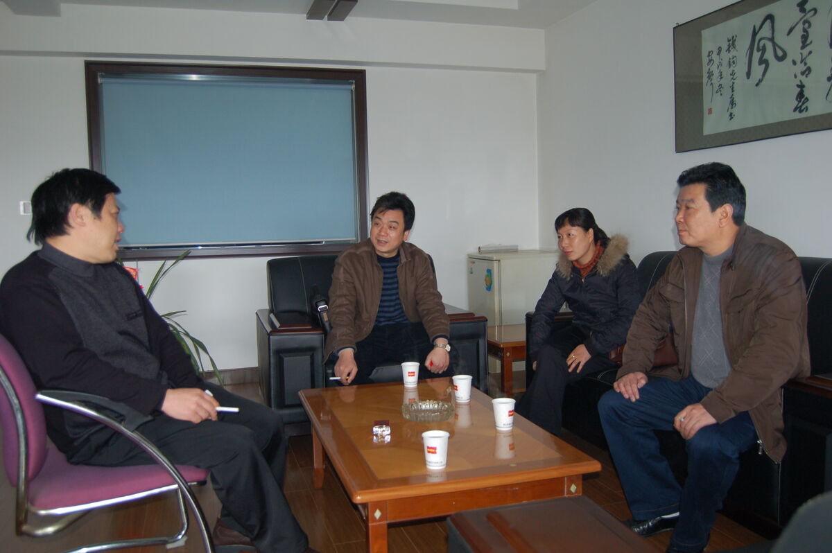 图为街道领导与浙东丝绸(印染、板业)有限公司董事长茹益军亲切座谈