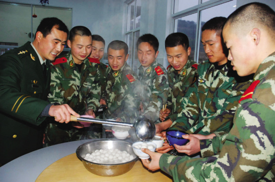 昨日,驻嵊武警中队的众多官兵在新搬进的军营里度过了首个元宵节,官兵们煮汤圆、唱军歌,活跃了节日的气氛,感受着军队大家庭的欢乐与温馨。图为官兵们正在分汤圆。 (金海英 摄)