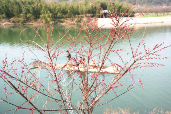 近日,施家岙追鱼山庄50多亩1300多株梅花竞相开放,游客在此漂流、赏梅、烧烤兴趣更浓。图为游客乘竹排赏景的情景。