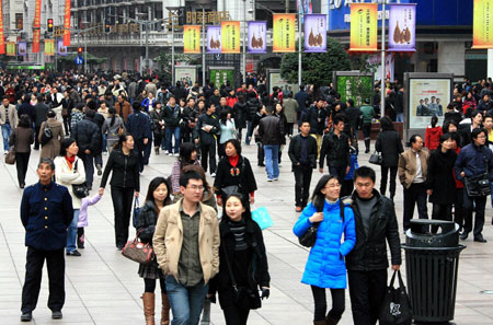 新华网上海频道2月16日报道: 2月15日,上海市南京路上人流如织。 日前公布的《2008年上海市国民经济和社会发展统计公报》显示,至2008年末,上海全市常住人口总数达1888.46万人。 新华社记者 陈飞摄