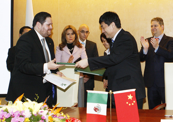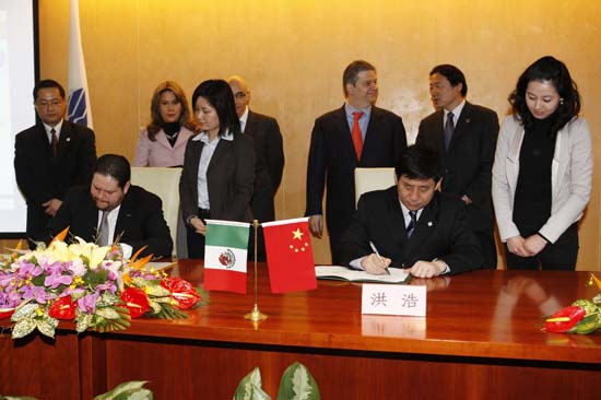 2月18日,墨西哥驻沪总领事米格尔·巴里奥(前左)与上海世博会事务协调局局长洪浩(前右)互换签署的合同文本。