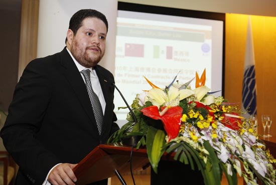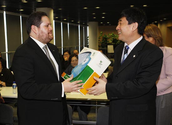 2月18日,上海世博会事务协调局局长洪浩(右)向墨西哥驻沪总领事米格尔·巴里奥(左)赠送世博吉祥物“海宝”。