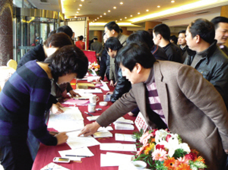 一位人大代表指着名单上自己的名字向大会工作人员报到。
