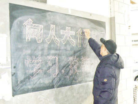 昨日上午,73岁的沈老伯早早来到嵊州剧院,在会场入口处的黑板上欣然写下了“向人大代表学习致敬”的宣传标语,表达自己的喜悦之情。
