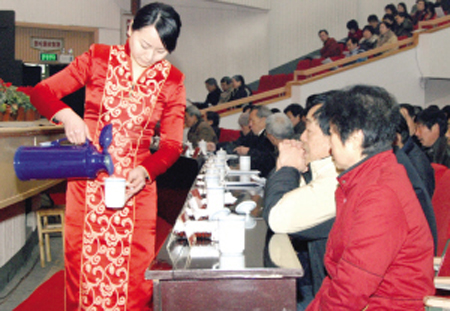 “两会”上,工作人员正在为与会人员倒开水。
