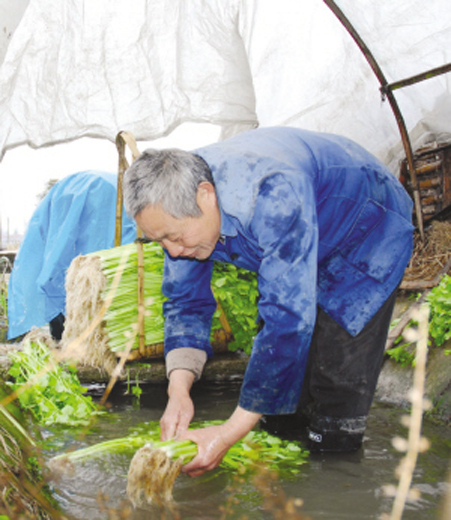 3月5日,崇仁镇三村的菜农裘樟樵在临时搭建的雨篷里,清洗刚刚采摘的芹菜。