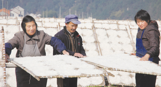 榨面是我市的传统特产,它的生产对天气的要求很高。在告别了连续20多天的阴雨天之后,昨天,甘霖镇殿前村榨面专业户利用晴好天气晾晒榨面,大家的脸上露出了开心的笑容。