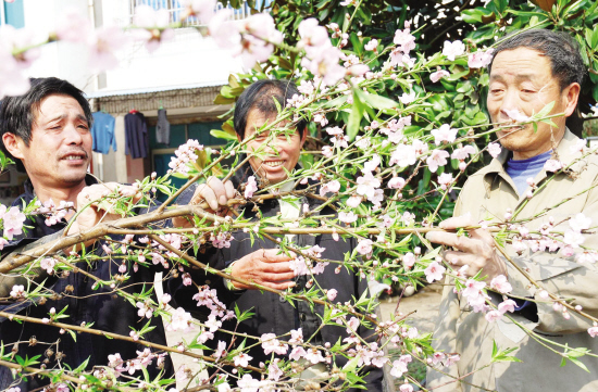 近日记者在金庭镇华堂村马路边看到,一户农家小院的桃树已开花,因这棵桃花花期较早,引来了左邻右舍的观看。