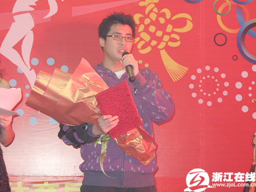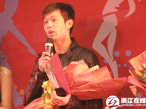 晚上7时许,一帮老记们早早地就等在了浙江体育职业技术学院的报告厅,“来了”,老记们一阵骚动,帅气的朱启南身穿黑色的夹克,下身是牛仔裤配休闲鞋,长枪短炮齐刷刷地对准了他。