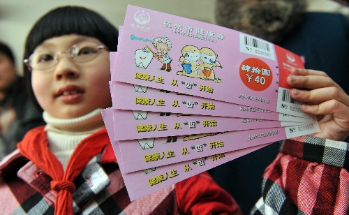 新华网长三角频道3月12日报道:3月11日,一位小学生在杭州市健康券发放现场展示健康券。当天,杭州市开始向主城区包括农民工子弟在内的约20万小学、初中学生发放健康券,每张健康券的面额为40元,总额度为1600万元,有效期至2009年12月31日。健康券主要用于中小学生的口腔保健,可在杭州市定点医疗机构使用。 新华社记者 王定昶 摄
