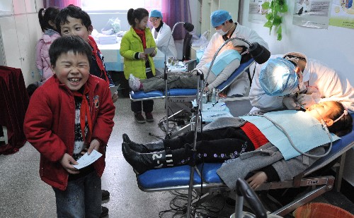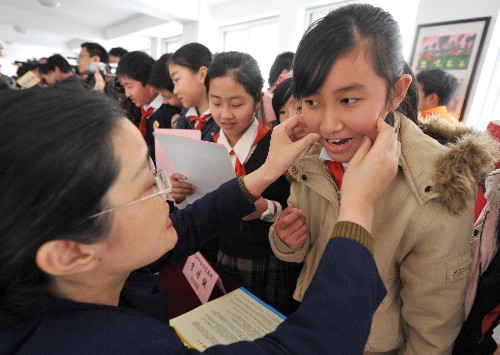 3月11日,在健康券发放现场,一位即将接受牙齿窝沟封闭治疗的小学生(左前)又喜又怕。 当天,杭州市开始向主城区包括农民工子弟在内的约20万小学、初中学生发放健康券,每张健康券的面额为40元,总额度为1600万元,有效期至2009年12月31日。健康券主要用于中小学生的口腔保健,可在杭州市定点医疗机构使用。 新华社记者 王定昶 摄