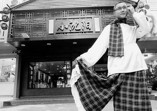 浙江在线03月16日讯 白色衬衫,红格子围巾,一手夹着菜单,一手撩着苏格兰裙裤,还有一点娘娘腔……这不是“小沈阳”吗?
