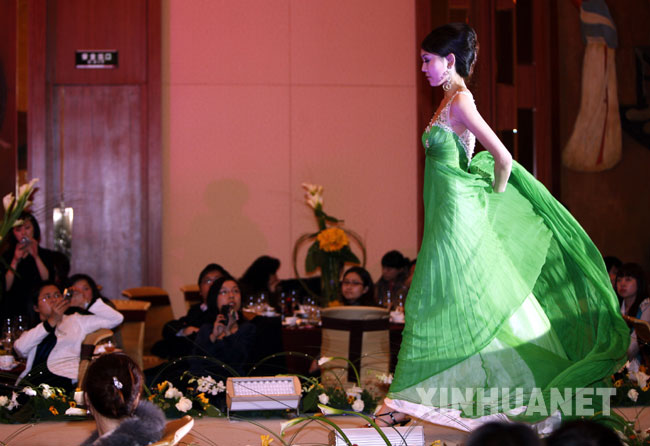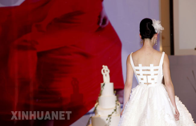 新华网上海频道3月22日报道:3月22日,一位模特在展示一款婚纱。当日,一场“中国风 婚礼秀”在上海希尔顿酒店举行。T台模特以红、白、绿、黄为色调的婚纱秀,尽显奢华、典雅、端庄,给在场准新人和来宾带来视觉享受。据悉,2009年,上海希尔顿酒店将联合利趣门婚礼策划、5D钻石珠宝、JTB旅行社、柯达、Honey Honey喜糖、OSSO鞋业、理肤泉、希尔顿水疗等为每对新人量身订制,筹办个性化的主题婚礼。新华社记者张明摄