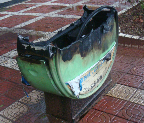 位于官河路北端安平里地段的这只原本美丽的圆形垃圾箱,不知被谁用火烧成了这个模样(如图),看了使人不是滋味。