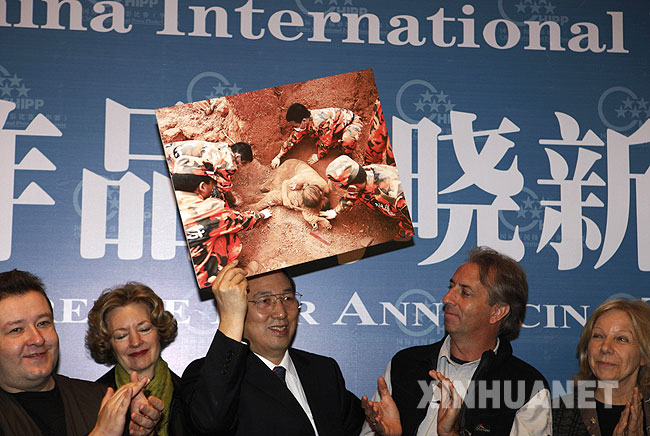 新华网上海频道3月25日报道:3月25日,中国新闻摄影学会执行主席、华赛评委会主席赵德润(左三)手举获2008年度新闻照片奖《母爱.地震》。当日,第五届国际新闻摄影比赛(华赛)在上海松江新城揭晓。中国摄影师邹森拍摄的《母爱.地震》获2008年度新闻照片奖。