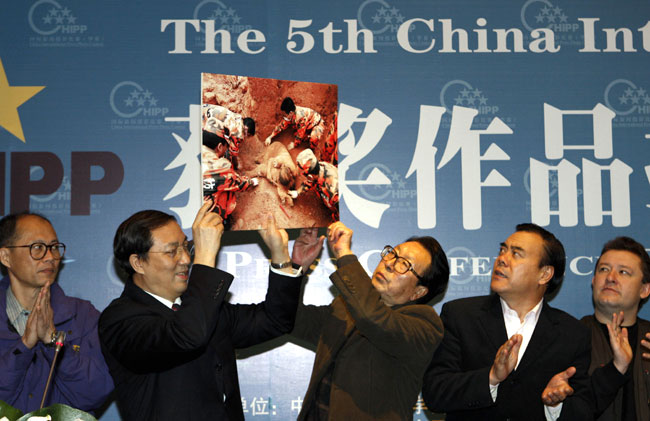 中国新闻摄影学会执行主席、华赛评委会主席赵德润(左二)、中国新闻摄影学会副主席、评委胡颖(左三)共同举起获2008年度新闻照片奖《母爱.地震》。