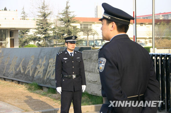 2009年3月26日,两名警察在石家庄市中级人民法院外执勤。当日,三鹿问题奶粉系列刑事案件二审由河北省高级人民法院在石家庄市中级人民法院开始正式公开审理。 新华社记者 王昆摄